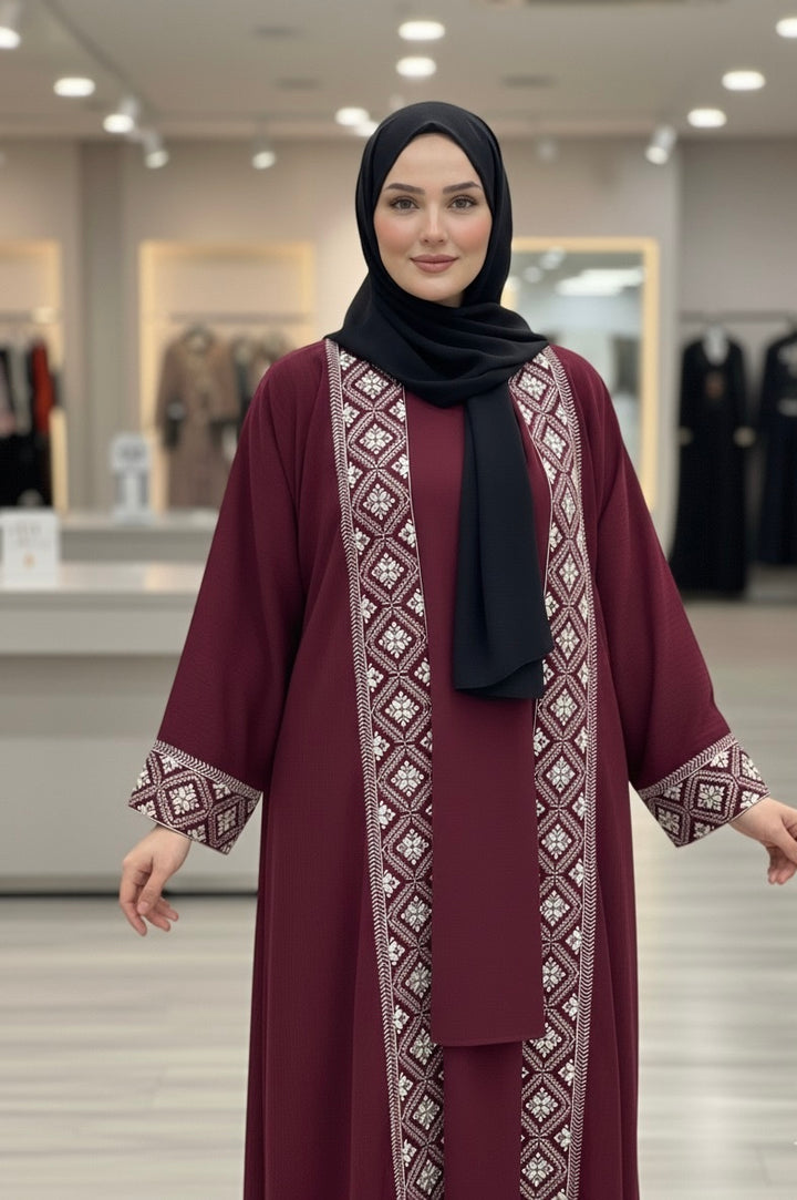 La vedette de cette pièce est la broderie blanche méticuleuse et de haute qualité qui crée un motif géométrique saisissant. Ce détail complexe encadre magnifiquement l'avant de l'abaya et orne les poignets, offrant un contraste luxueux avec le tissu riche et profond.