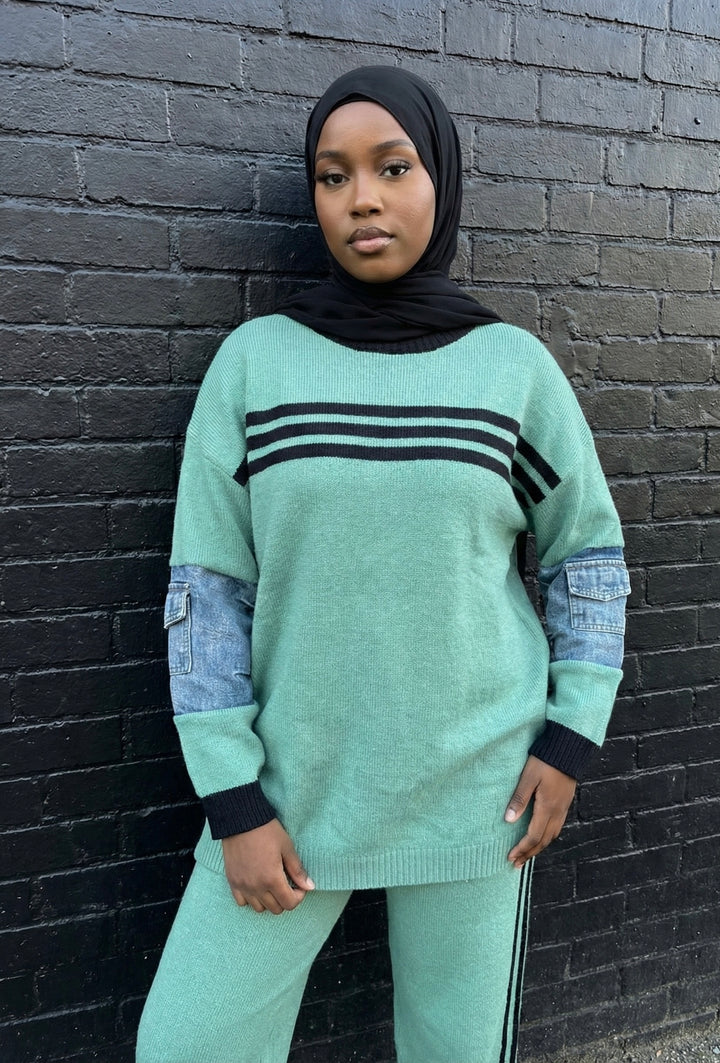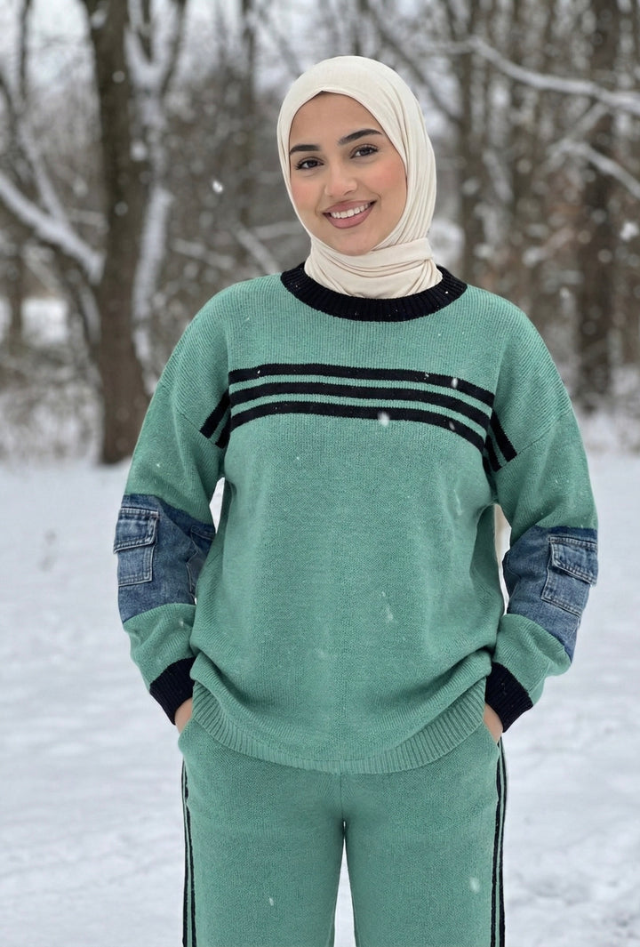 Ensemble Coordonné en Maille Vert Sauge - Détails Rayures et Denim