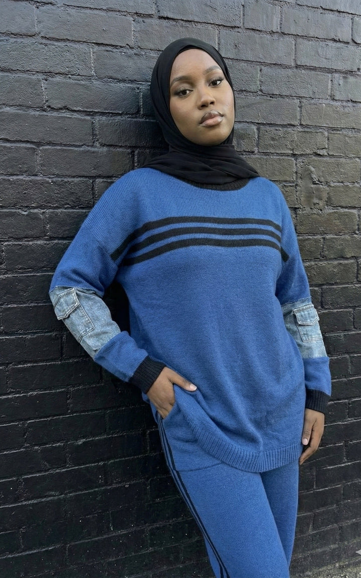 Restez au chaud et stylée cet hiver avec notre ensemble deux pièces en maille bleue. Ce duo confortable comprend un pull à col rond orné de rayures noires modernes et de manches cargo en denim uniques, ainsi qu'un pantalon assorti avec des bandes latérales noires. Parfait pour les journées décontractées, cet ensemble allie confort et tendance.
