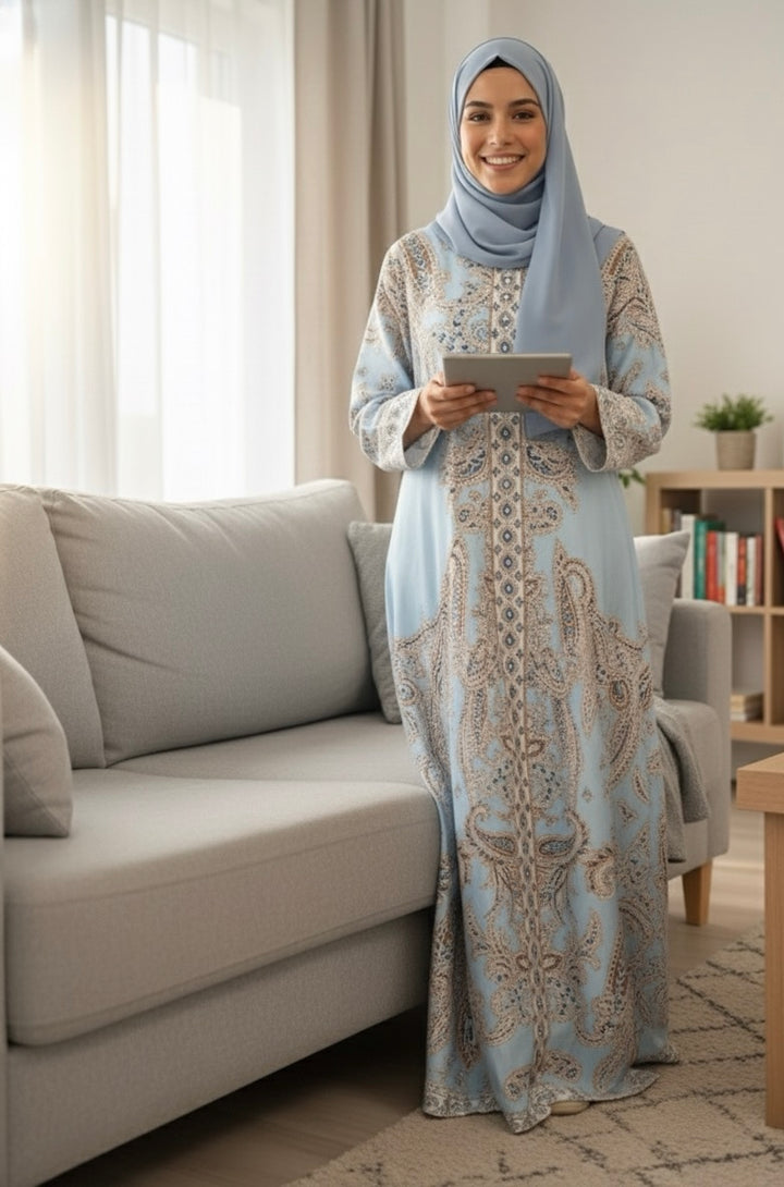 Sublimez votre allure avec cette abaya chic en bleu ciel, ornée de magnifiques motifs dorés pour une touche raffinée et féminine. Confortable et fluide, elle est parfaite pour les occasions spéciales ou les soirées élégantes. Disponible en tailles S et M.